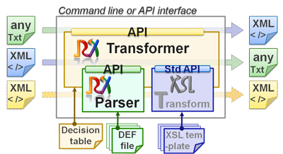 You can actually put the DEF file in the software archive itself, so you would just need to pass your input data file as argument to a java program contained in a single jar (inclusive of meta-data). Moreover, The reverseXSL Transformer automates the combined use of XSLT and the reverseXSL Parser, with the help of a mapping decision table. The Transformer identifies arbitrary input messages, looks up the decision table for relevant Transformation steps, and executes these. Therefore, the Transformer maps XML to XML, XML to flat / text or EDI, EDI to XML, text to XML, text to flat, EDI to flat, and so forth. It can also act as a pass-through for selected messages, thus generalizing the means to import and export data for target applications.