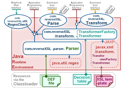 - A transformer package, with the usual TransformerFactory and Transformer classes, that combine the functions in JAXP (Java API for XML Processing, notably containing XSLT) with those from the reverseXSL Parser such as to extend the transformation capabilities natively found in Java runtimes.
